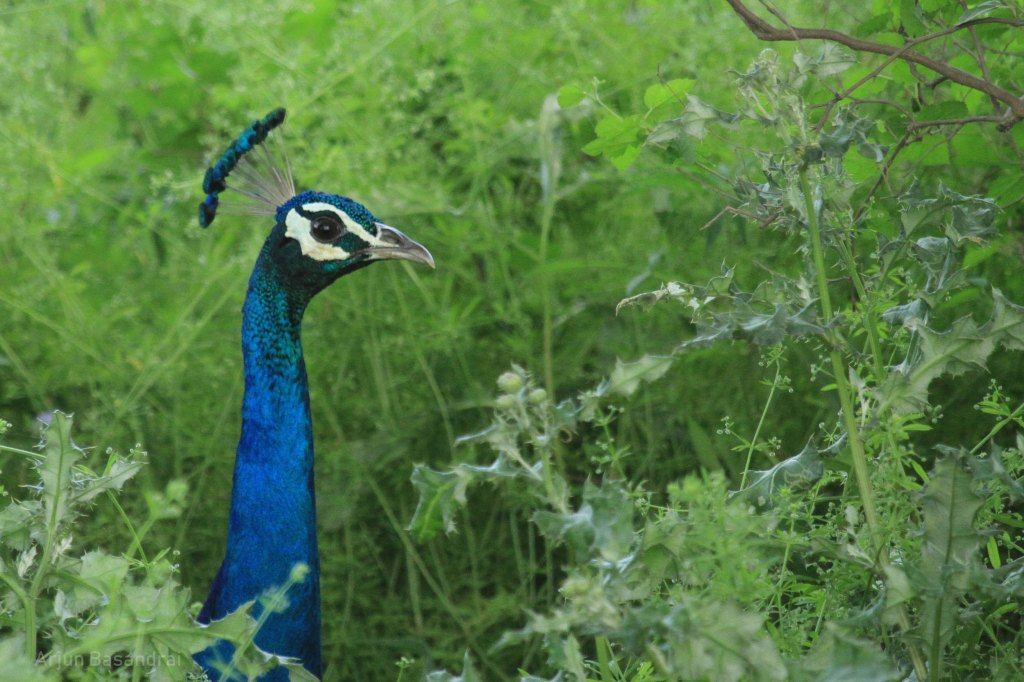 We were welcomed by an Indian Peafowl male who crossed the road in front of us to hide into some bushes in close vicinity, exposing only its blue neck and head.