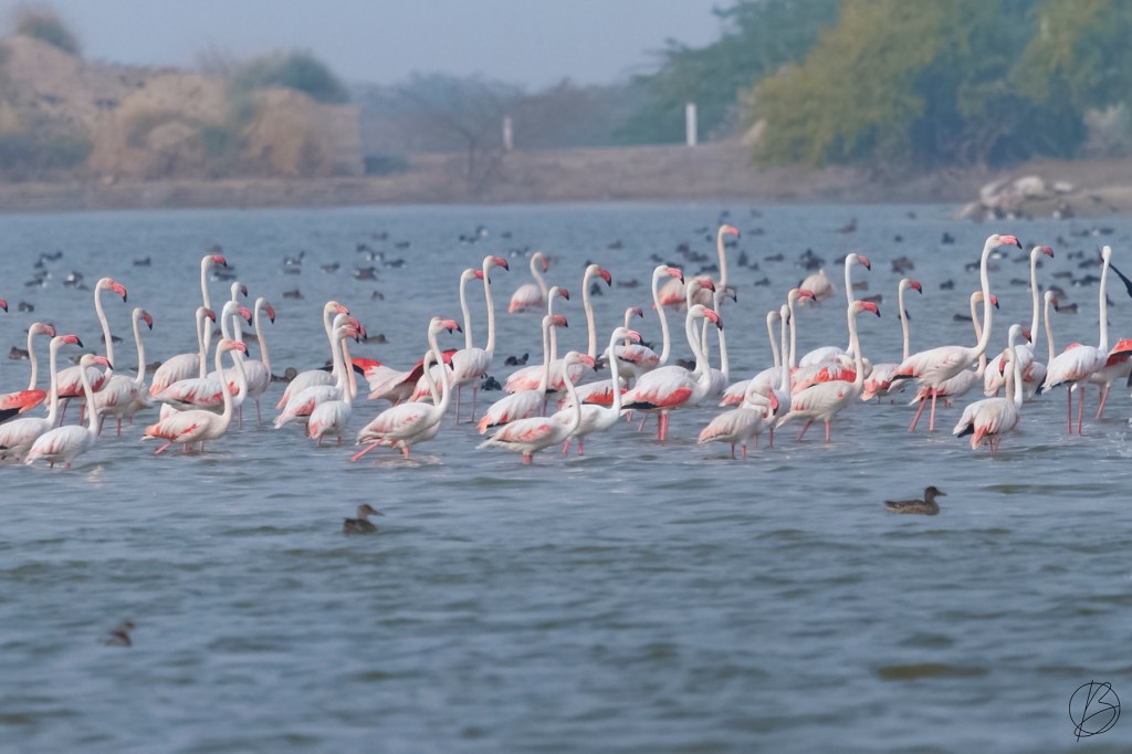 We reached the lake in about 10-15 mins. The first thing we saw there were a pair and a juvenile of Common Cranes which were flushed by our car. The next thing we saw left us awestruck. We witnessed about 500 Greater Flamingos feeding in the middle of the lake. The lake was fenced and there seemed no way we could get close to the birds. We walked around the lake to get as close as possible to the Flamingos. In the process we found a place where there was no barbed wire between a few fence posts. I went straight in and of course flushed all the Flamingos, but, they were very forgiving and came back in a few minutes.